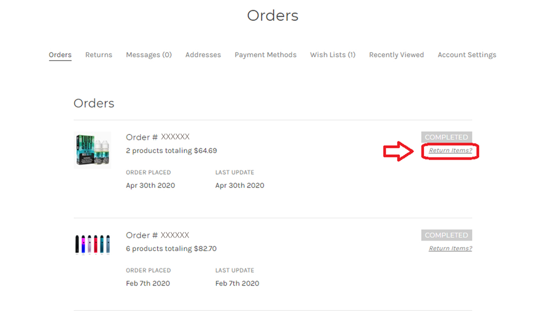 5. Click on "Return Items?" for the order #